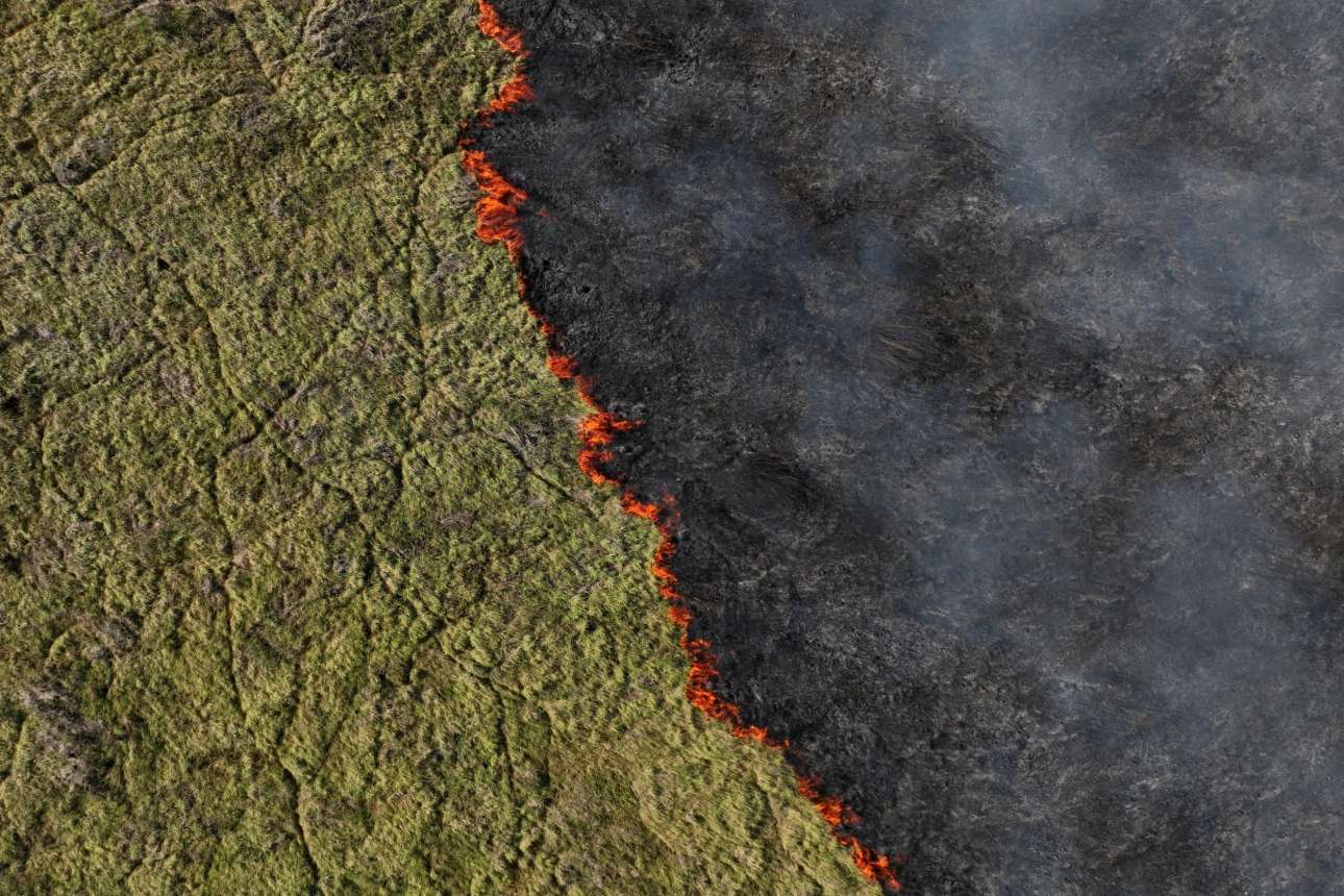 Και οι υγροβιότοποι λαμπαδιάζουν από πυρκαγιές, αφού οι φλόγες τούς καρβουνιάζουν αργά, σχεδόν σαδιστικά, όπως δείχνει και το καρέ από τη βραζιλιάνικη Πολιτεία Μάτο Γκρόσο ντο Σουλ