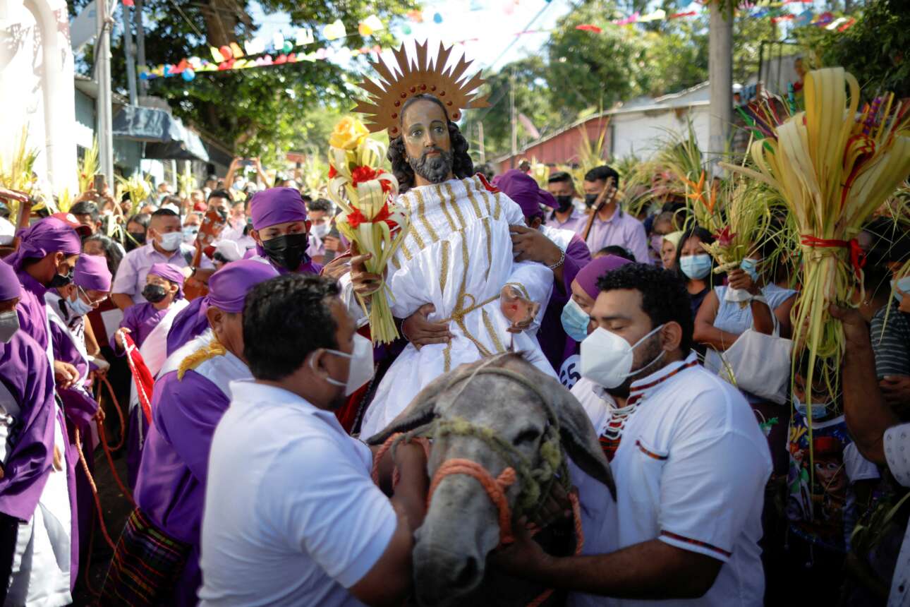 Αγαλμα του Χριστού επί πώλου όνου εισέρχεται στην προσομοίωση Ιεροσολύμων που έστησαν οι ρωμαιοκαθολικοί στο Παντσιμάλκο του Ελ Σαλβαδόρ: εκεί ο λαός είναι φτωχός, η πίστη του στη βασιλεία του Θεού μεγάλη και η αγάπη τέχνη παραστατική – καρέ από την Κυριακή των Βαΐων του δυτικού δόγματος, το οποίο διακινήθηκε τη Δευτέρα 11 Απριλίου