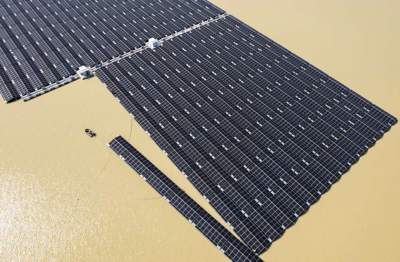 Πρόβα απεξάρτησης από το ρωσικό… βενζινάδικο: φουσκωτό ρυμουλκεί και στοιχίζει ηλιακά πάνελ στην πλωτή φωτοβολταϊκή μονάδα παραγωγής ενέργειας που κομμάτι το κομμάτι εγκαθίσταται στην επιφάνεια της Ασημένιας Λίμνης (Silbersee) της πόλης Παραλίμνιο Χάλτερν (Haltern am See) – στη Γερμανία, φυσικά