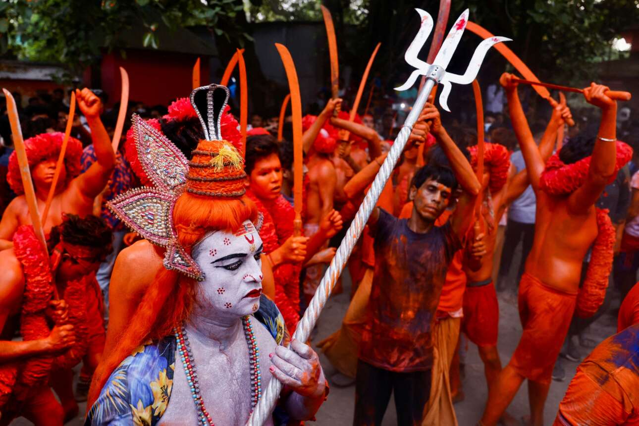 Ινδουιστικός διονυσιασμός, πολεμικού χαρακτήρα: χορός θρησκευομένων με σπαθιά και χαντζάρια σε πόλη του Μπανγκλαντές, χώρας με βασική θρησκεία τον μωαμεθανισμό – οι χορευτές εορτάζουν το φεστιβάλ Lal Kach και είναι βαμμένοι πατόκορφα με χρώμα που ρέπει στο αιμάτινο εκκινώντας από το κατεξοχήν ινδουιστικό πορτοκαλί
