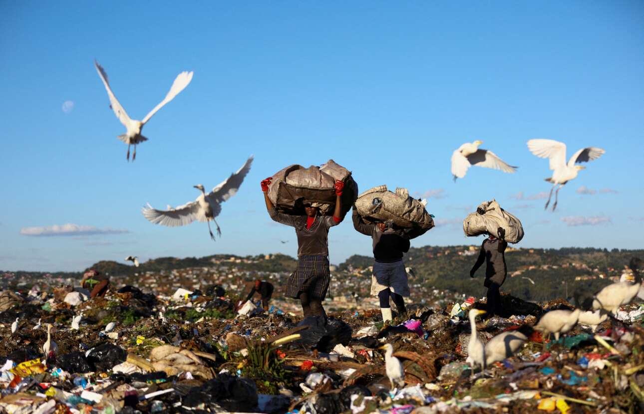 Με τον επίμοχθο τρόπο που βλέπετε μαύρες Νοτιοαφρικανές μεταφέρουν μέσα σε τσουβάλια ό,τι πολύτιμο μπόρεσαν να μαζέψουν από τον σκουπιδότοπο στα περίχωρα του Γιοχάνεσμπουργκ, δηλαδή ανακυκλώσιμα υλικά κάθε είδους: βαριά δουλειά, για πενταροδεκάρες – οι γλάροι με το αρπαχτικό φτερούγισμα της ανάγκης τους ολοκληρώνουν το θέμα του καρέ