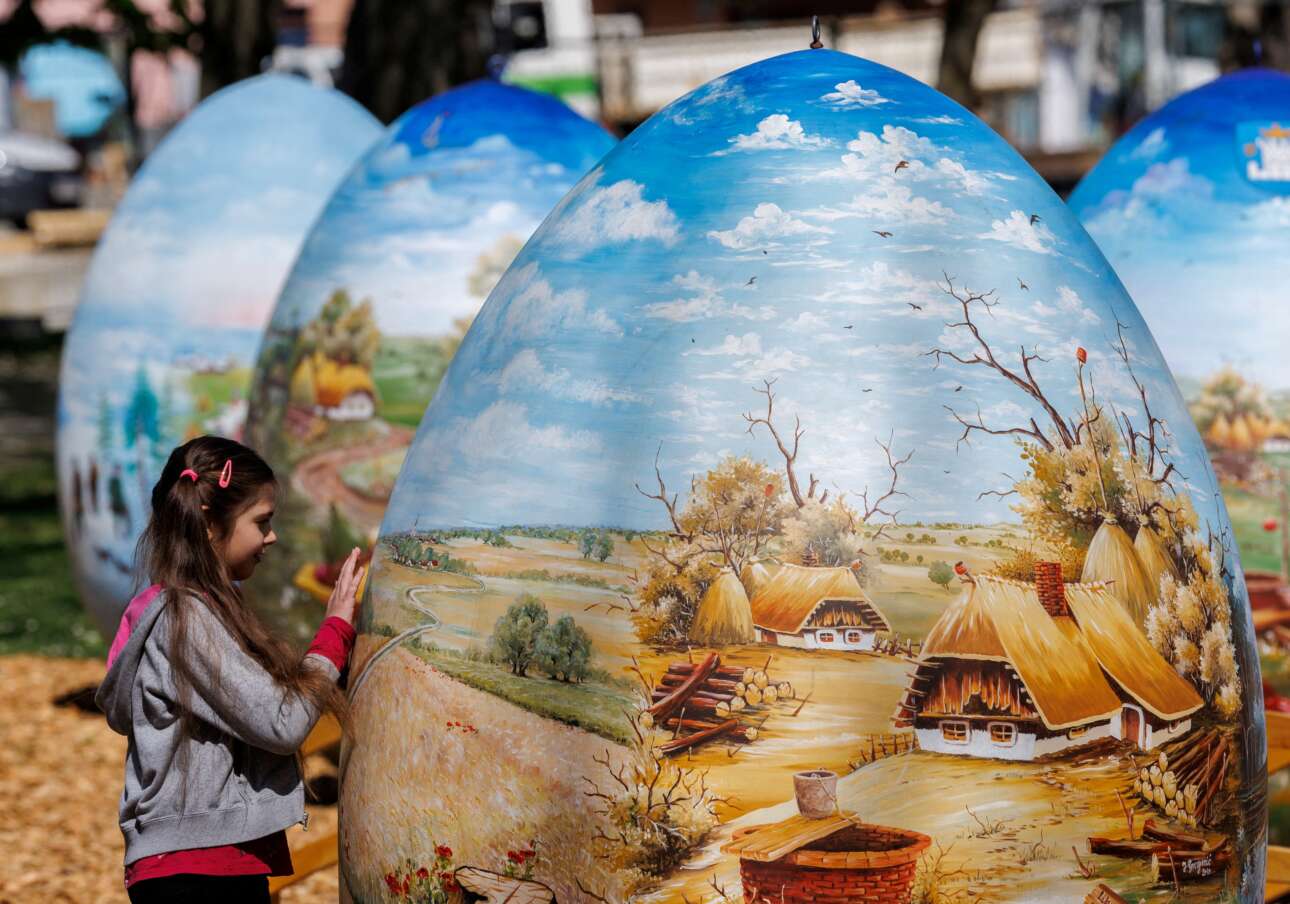 Στην Κοπρίβνιτσα, στον Βορρά της Κροατίας, ένα κορίτσι περιεργάζεται δίμετρα πασχαλινά αυγά φτιαγμένα από πολυεστέρα και ζωγραφισμένα με ναΐφ παραστάσεις μιας παραμυθένιας πια αγροτικής ζωής – τα συγκεκριμένα καλλιτεχνήματα προορίζονται να στολίσουν δημόσιους χώρους αυτήν την περίοδο, σε όλη τη χώρα