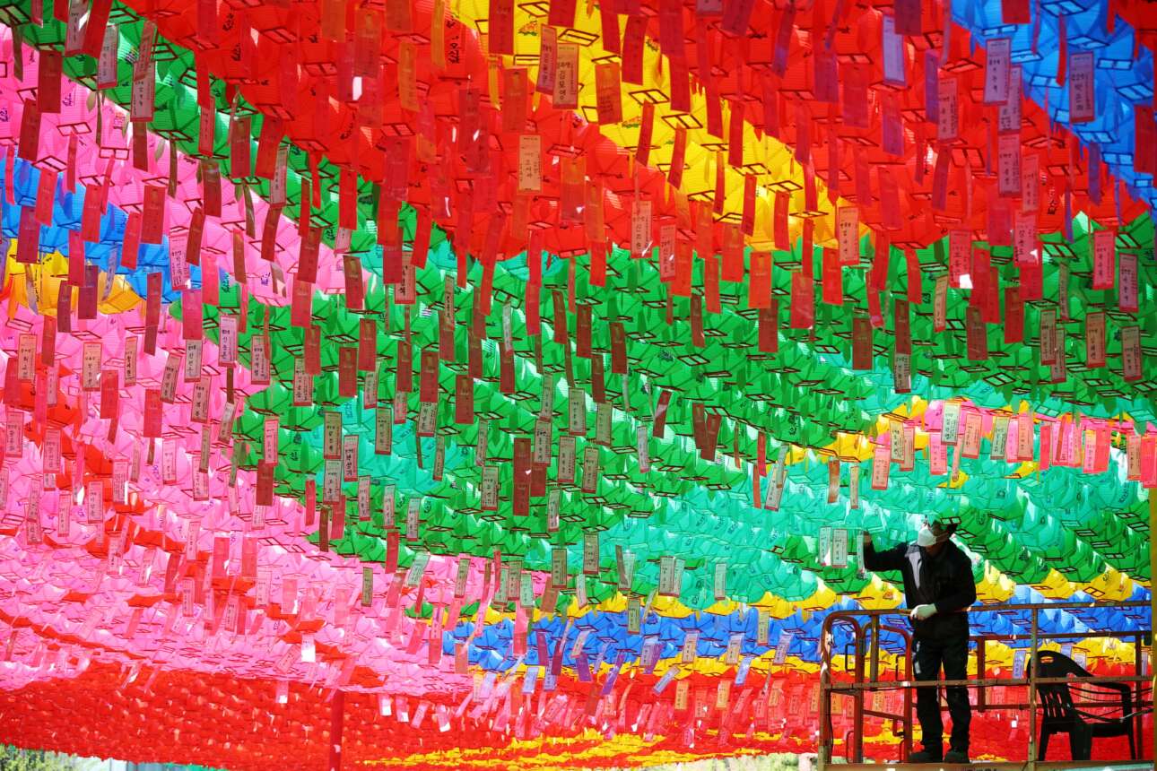 Ακόμη ένα καρέ με θρησκευτικό υπόβαθρο, από βουδιστικό ναό της Σεούλ αυτή τη φορά: ο εργάτης κρεμάει στα πολύχρωμα φαναράκια τα χαρτάκια των πιστών με τις ταπεινές τους παρακλήσεις για καλή υγεία, κ.λπ. – όλα αυτά στο πλαίσιο της προετοιμασίας για τον επερχόμενο εορτασμό των γενεθλίων του Βούδα