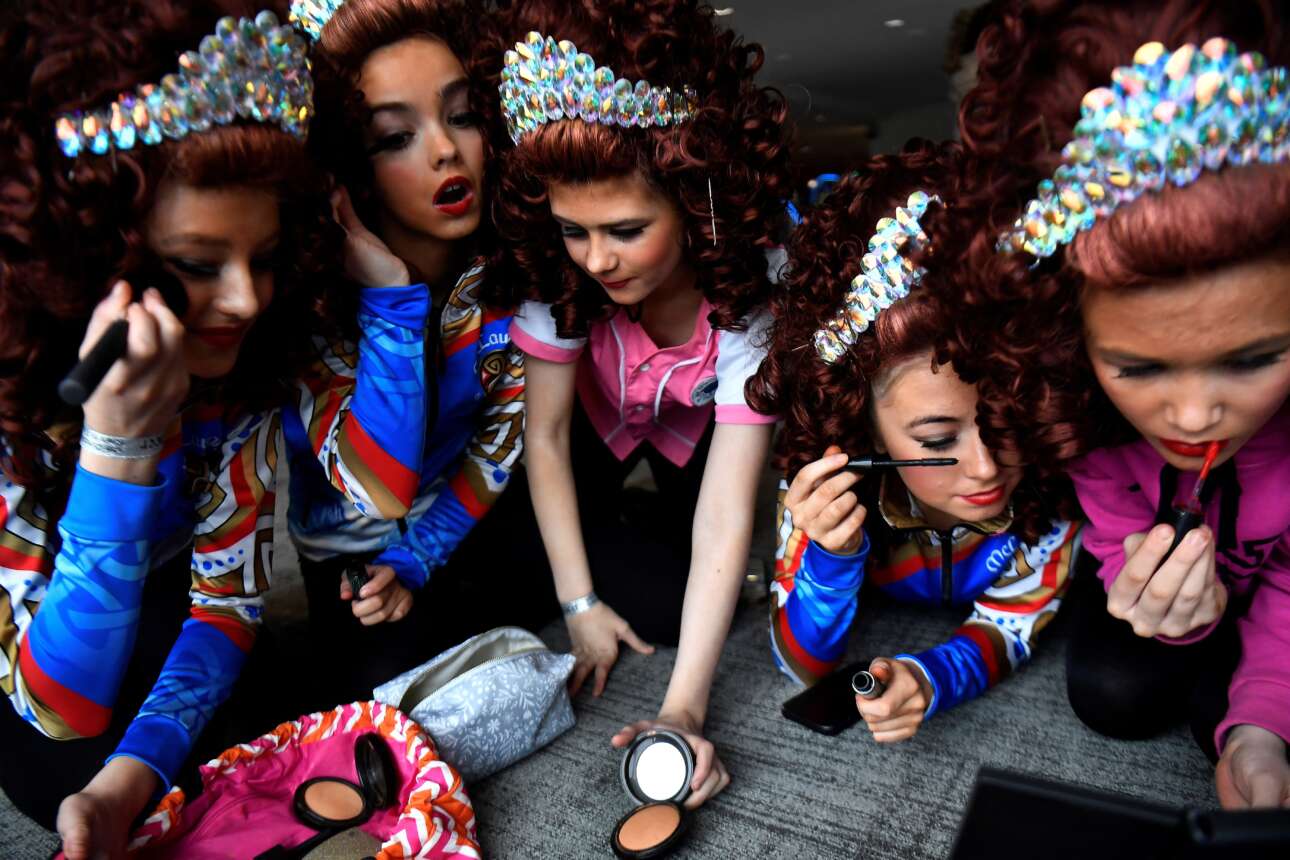 Σκωτσέζες του εκπαιδευτηρίου McLoughlin της Γλασκώβης μακιγιάρονται στα πεταχτά καθώς ετοιμάζονται να συμμετάσχουν στο «παγκόσμιο πρωτάθλημα ιρλανδικού χορού» που έχει ιστορία μισού αιώνα – καρέ από το Μπέλφαστ της Βόρειας Ιρλανδίας