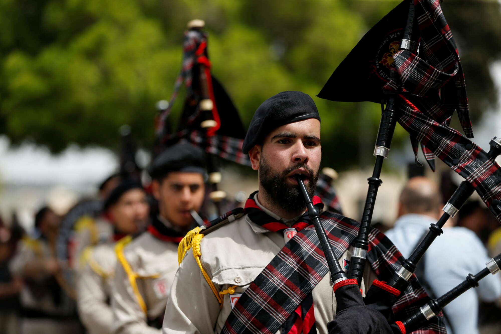 Με καρό ταρτάν και γκάιντες μοιάζουν με Σκωτσέζους, όμως είναι Παλαιστίνιοι πρόσκοποι που παίζουν για τον εορτασμό της Κυριακής των Βαΐων στην πλατεία του Ναού της Γεννήσεως, στη Βηθλεέμ