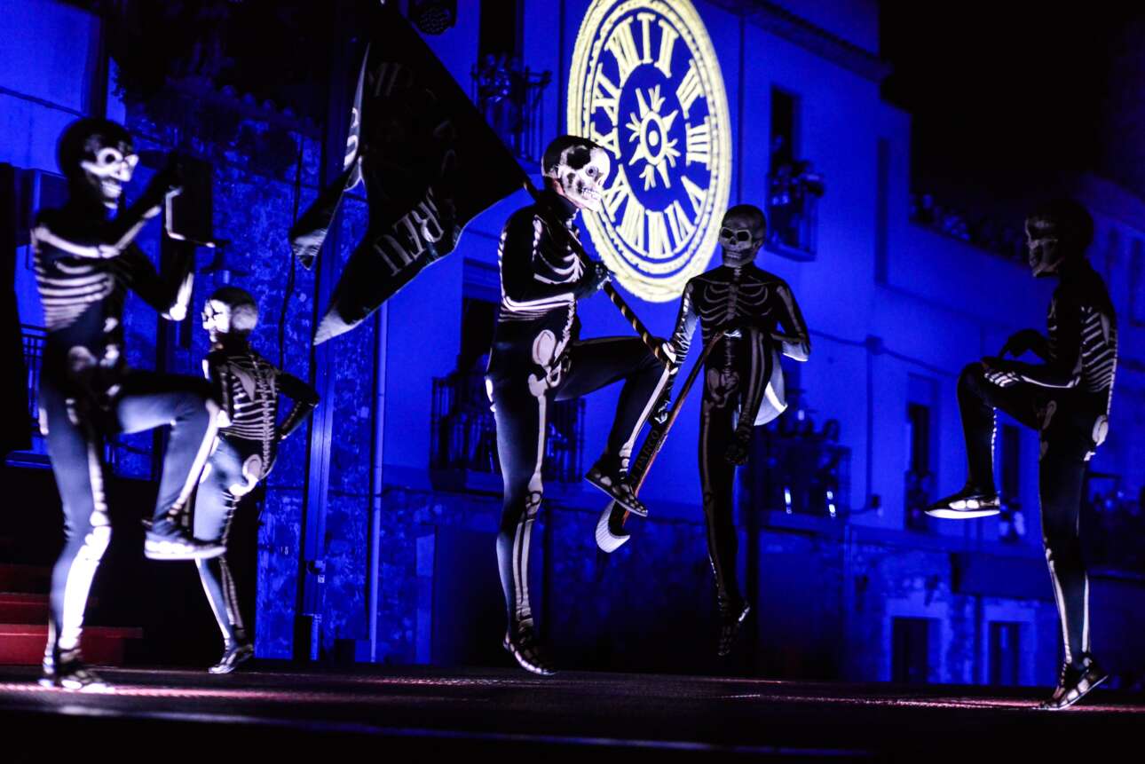 Στιγμιότυπο από «δρώμενο» με αφορμή τη Μεγάλη Πέμπτη των Καθολικών στην Τζιρόνα της Καταλονίας, το οποίο ονομάζεται «χορός των νεκρών» και ερμηνεύεται από δέκα άτομα ντυμένα με ιδιαίτερα κοστούμια – όπως βλέπετε, με τον κατάλληλο φωτισμό οι χορευτές μοιάζουν με σκελετούς στο τσακίρ κέφι: ξέρουν ότι ελέω Χριστού ο θάνατος πατιέται…
