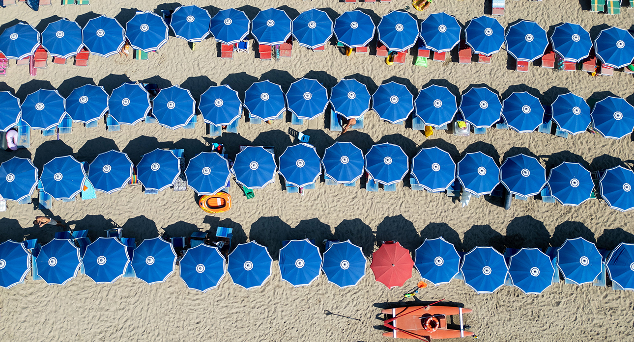 Μια άποψη από ψηλά παραλίας με ομπρέλες στη Σάντα Μαρινέλα, βόρεια της Ρώμης.