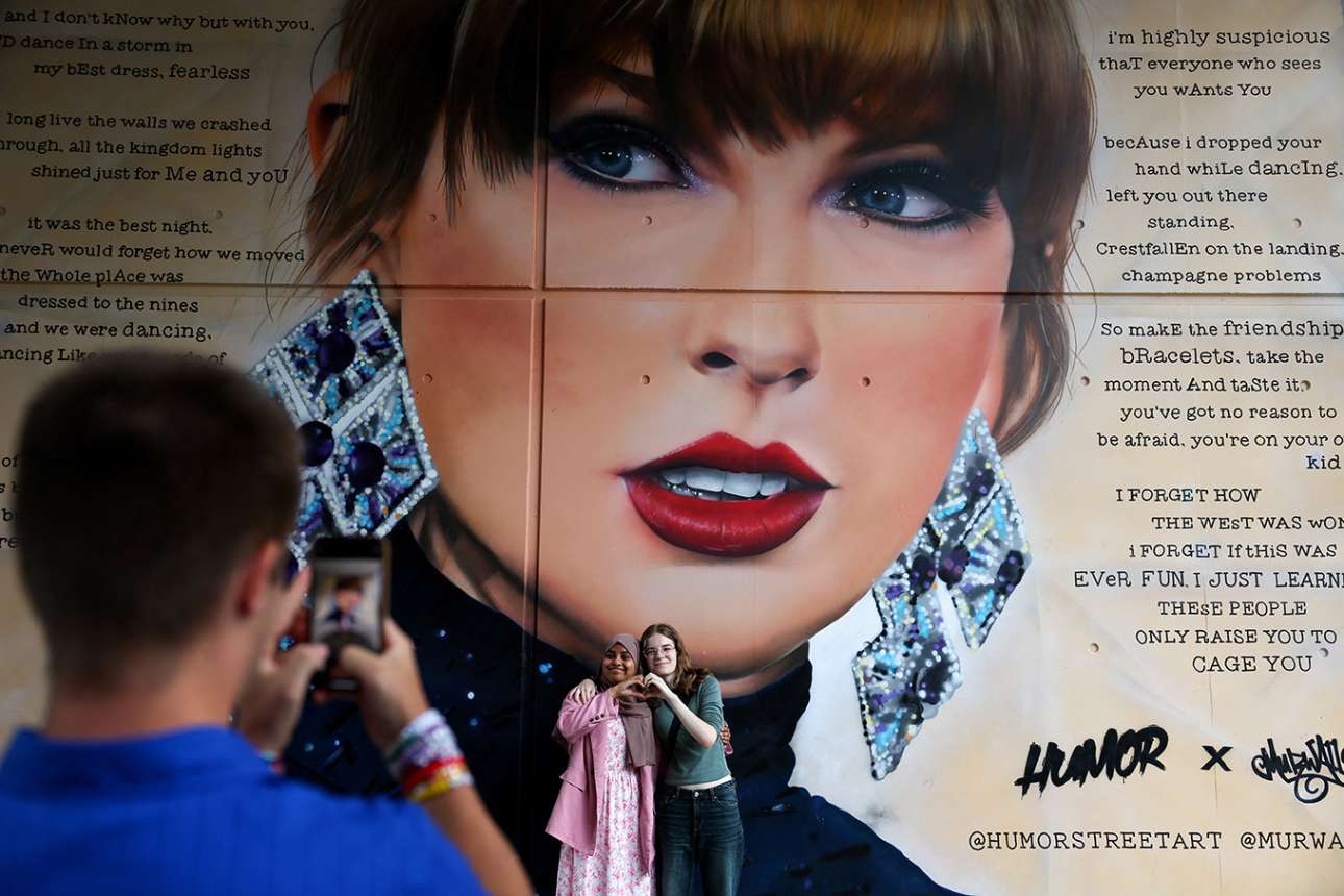 Θαυμαστές της Τέιλορ Σουίφτ ποζάρουν για μια φωτογραφία δίπλα σε αφίσα της βασίλισσας της ποπ πριν από τη συναυλία της στο Στάδιο Γουέμπλεϊ στο Λονδίνο, μετά την ακύρωση τριών συναυλιών της σταρ στη Βιέννη λόγω σχεδιαζόμενης τρομοκρατικής επίθεσης.