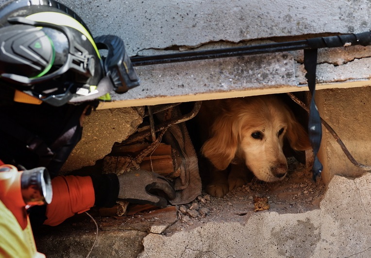 Ο Κανέλος, ο σκύλος από την Αντιόχεια, δεν είναι διασώστης, αλλά διασωθείς: πορτογάλοι πυροσβέστες τον έβγαλαν αλώβητο από τα μπάζα του κτιρίου που τον καταπλάκωσε, όμως δεν το πιστεύει ο δόλιος