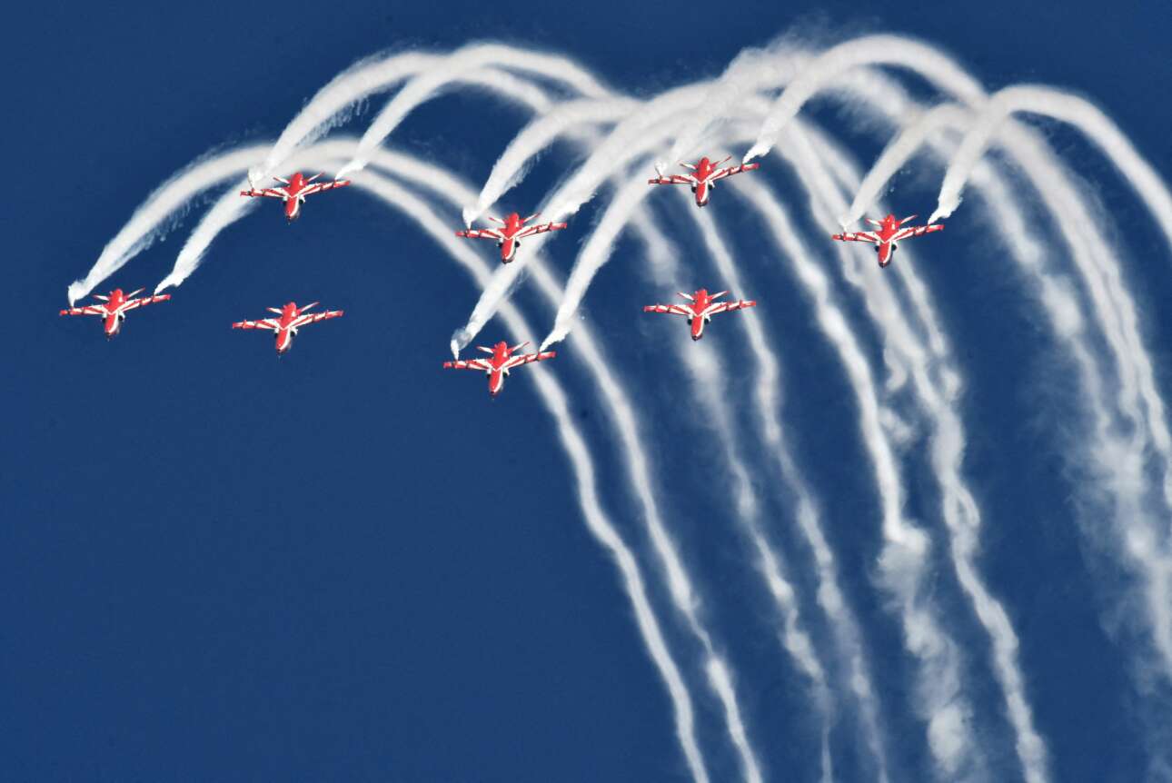 Στον ουρανό δεν σχηματίζουν, βέβαια, ερωτευμένες καρδιές τα αέρια που αφήνει το ινδικό σμήνος ακροβατικών αεροπλάνων, όμως η δουλειά του πιλότου πολεμικού αεροσκάφους δεν είναι παίξε και γέλασε, προϋποθέτει «καρδιά» και τόλμη – καρέ από την έκθεση Aero India 2023