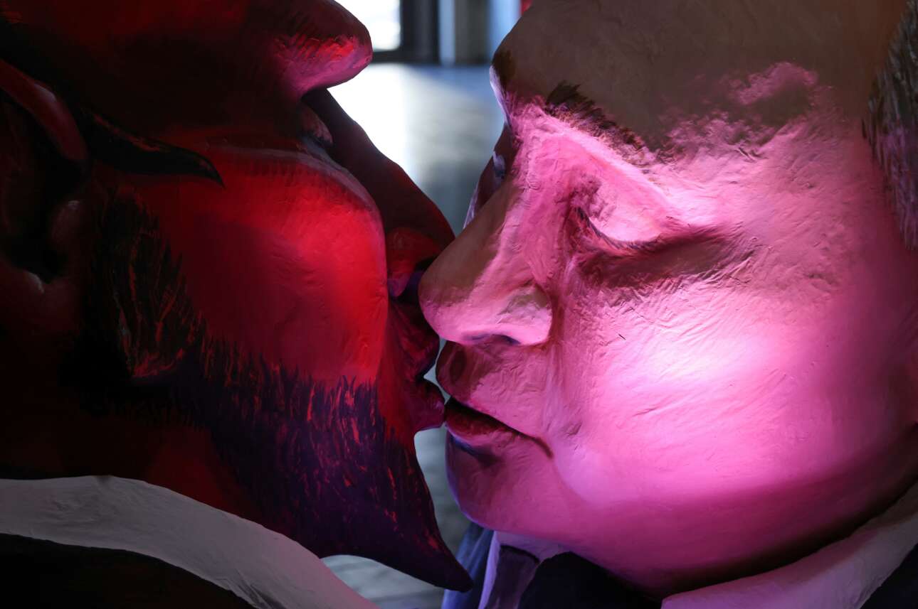 Αλλά και η μεταπολεμική (Β’ΠΠ) γερμανική αγάπη για τον «αμερικανό φίλο» δεν εξαντλείται με το φιλμ του Βιμ Βέντερς: προτού τα Leoprad φθάσουν στο Κίεβο, θα παρελάσουν τα καρναβαλικά άρματα στην Κολωνία, ένα εκ των οποίων δείχνει τον Πούτιν (δεξιά) αγκαλιά με τον οξαποδώ – οι εκτυφλωτικές ερυθροφούξια αποχρώσεις υπαινίσσονται ότι ο ασπασμός τους είναι επακόλουθο κολασμένου πάθους