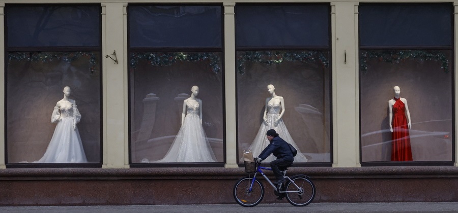 Ο ποδηλάτης στον δρόμο του και οι κούκλες στη βιτρίνα: σε αυτό το μοσχοβίτικο κατάστημα μόδας, όπως και σε όλα τα άλλα της Ρωσίας, πλέον πωλούνται νυφικά και τουαλέτες μόνο ντόπιας παραγωγής, αφού οι φίρμες ραπτικής παγκοσμίου τζίρου συμμορφώθηκαν προς τις Δυτικές κυρώσεις και εγκατέλειψαν τη χώρα – δεν την εγκατέλειψαν όμως οι εραστές
