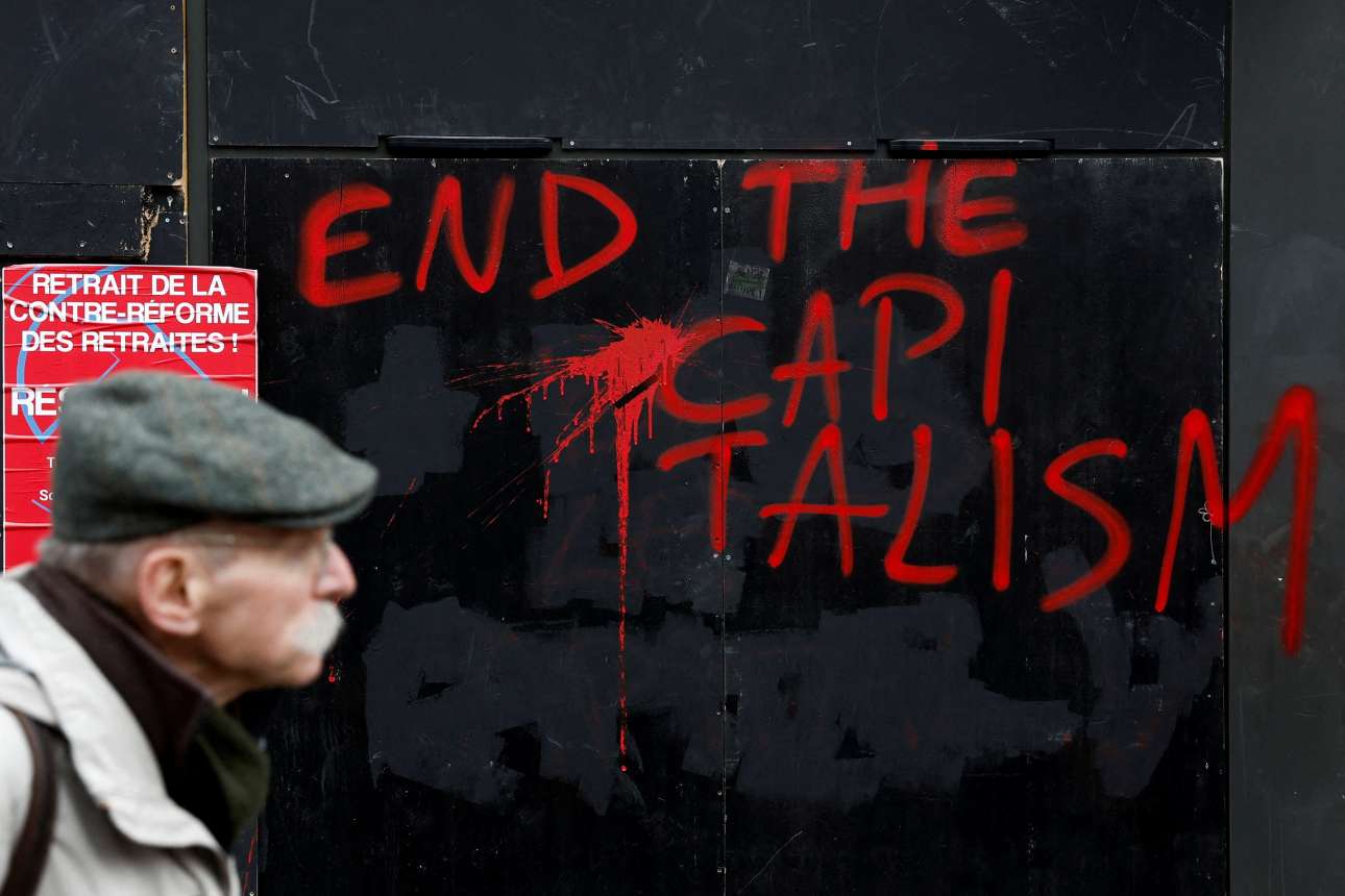 Οι Γάλλοι βγάζουν καντήλες με τις αγγλόγλωσσες φράσεις σε φίρμες, μενού, εφημερίδες, κ.λπ. είδη τους, πόσο μάλλον με τα αγγλόγλωσσα τσιτάτα: στο καρέ αυτό, από τις διαδηλώσεις για το νέο Ασφαλιστικό (προ προεδρικού διατάγματος, αλλά δεν έχει σημασία), το αδαές σπρέι διαλαλεί αγγλιστί τον μαξιμαλισμό του, ενώ η αφίσα, μετρημένη, απαιτεί γαλλιστί «απόσυρση της συνταξιοδοτικής αντιμεταρρύθμισης»