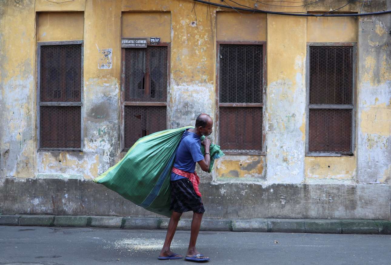 Χαμαλίκι Καλκούτας με ψυχοφθόρο κάματο που τον τονίζει το φυσικό ντεκόρ, ένα σοκάκι με ωχρό, σαπισμένο κτίριο