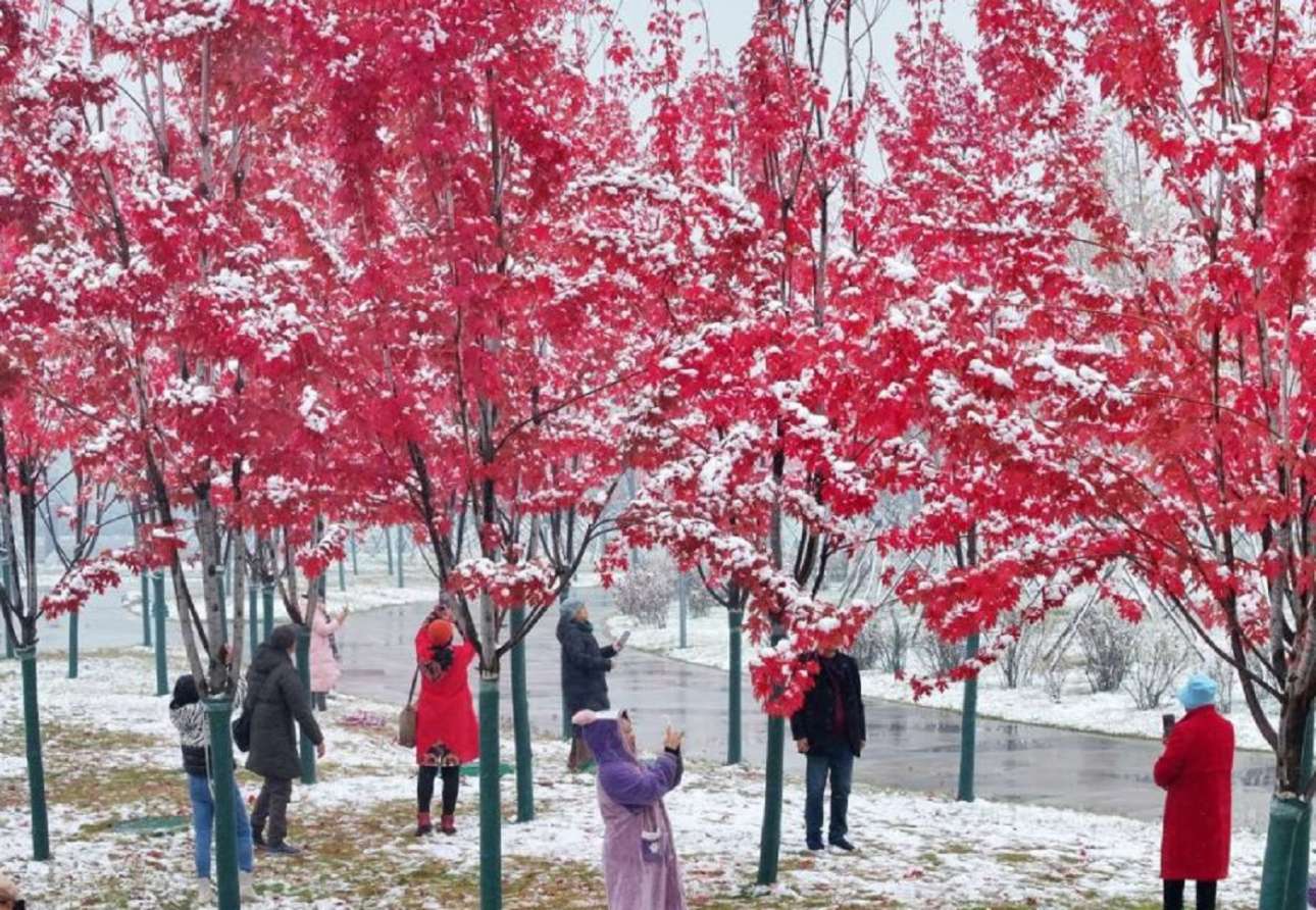 Το πρώτο χιόνι της σεζόν πανηγυρίστηκε στο Χαρμπίν της Μαντζουρίας με «σέλφι» κάτω από σφεντάμια με ερυθρό φύλλωμα