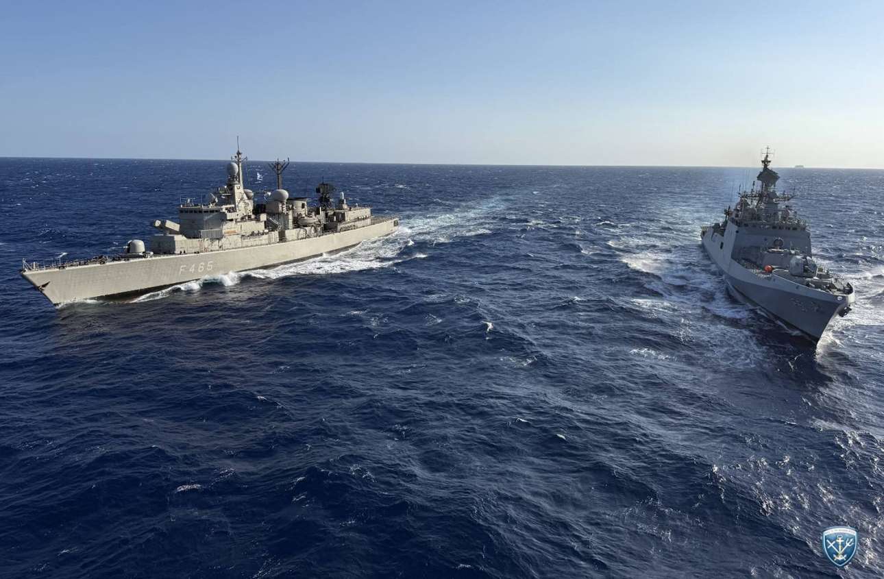 Ναυτική άσκηση Ελλάδος-Ινδίας έγινε στο Μυρτώο Πέλαγος, στην οποία συμμετείχε και η φρεγάτα «Θεμιστοκλής» (αριστερά)