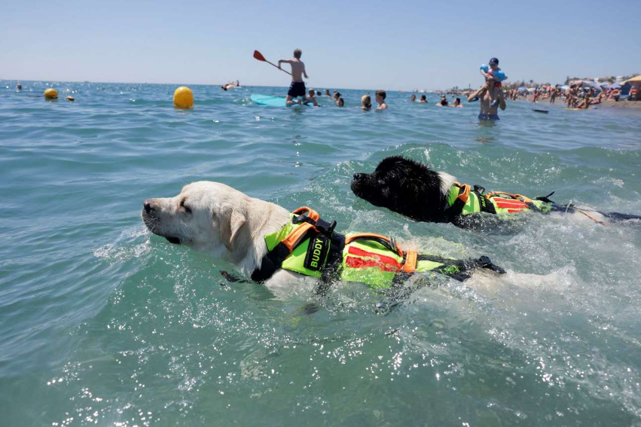 Ανθρωποι και ζώα δροσίζονται ταυτοχρόνως σε ισπανικά νερά. Τα σκυλιά εργάζονται, αφού εκπαιδεύονται για ναυαγοσώστες