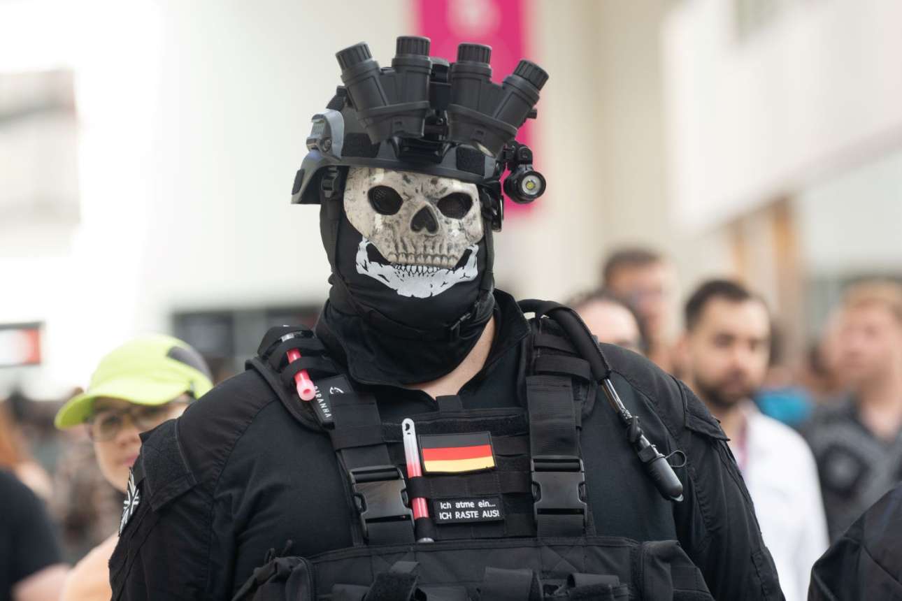 Μαυροντυμένος Γερμανός με μάσκα νεκροκεφαλής και αξεσουάρ βιολογικού πολέμου – δεν πήγε στο Βέβελσμπουργκ να προσκυνήσει, αλλά στην έκθεση βιντεοπαιχνιδιών Gamescom, στην Κολωνία, να ψυχαγωγηθεί
