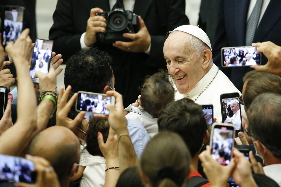 Βατικανό. Δεκάδες κινητά τηλέφωνα και ένας κανονικός φακός απαθανατίζουν τον αναρρωνύοντα από πρόσφατη εγχείρηση πάπα Φραγκίσκο, μαζί του και ένα παιδάκι