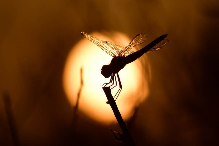 Οταν οι πλαγιές γύρω από την Αρχαία Ολυμπία φλέγονταν από τη μεγάλη φωτιά, στα χωράφια της Αργολίδας υπήρχε γαλήνη. Ετσι ο φακός συνέλαβε το έντομο πάνω στο κλαδάκι την ώρα του δειλινού. Μοιάζει να βουτάει στον πύρινο δίσκο παραδομένο σε μεθυστική παρόρμηση για ατομικό ολοκαύτωμα