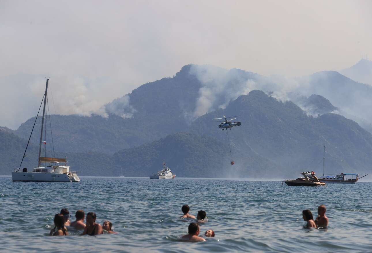 Σκηνή από τη δασική πυρκαγιά στη Μαρμαρίδα των Μούγλων, απέναντι από τη Ρόδο. Σαστισμένοι όσο και ανήσυχοι οι κολυμβητές, βλέπουν δίπλα τους το πυροσβετσικό ελικόπτερο να ανεφοδιάζεται με νερό
