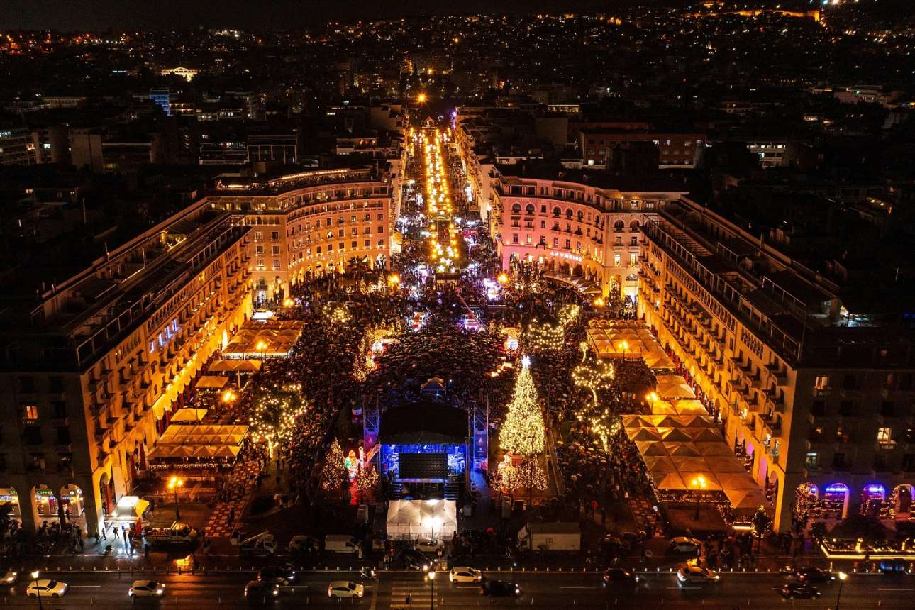 Πανοραμική άποψη της φωταγωγημένης χριστουγεννιάτικα πλατείας Αριστοτέλους στις 4 Δεκεμβρίου, στο κέντρο της παραλιακής Θεσσαλονίκης