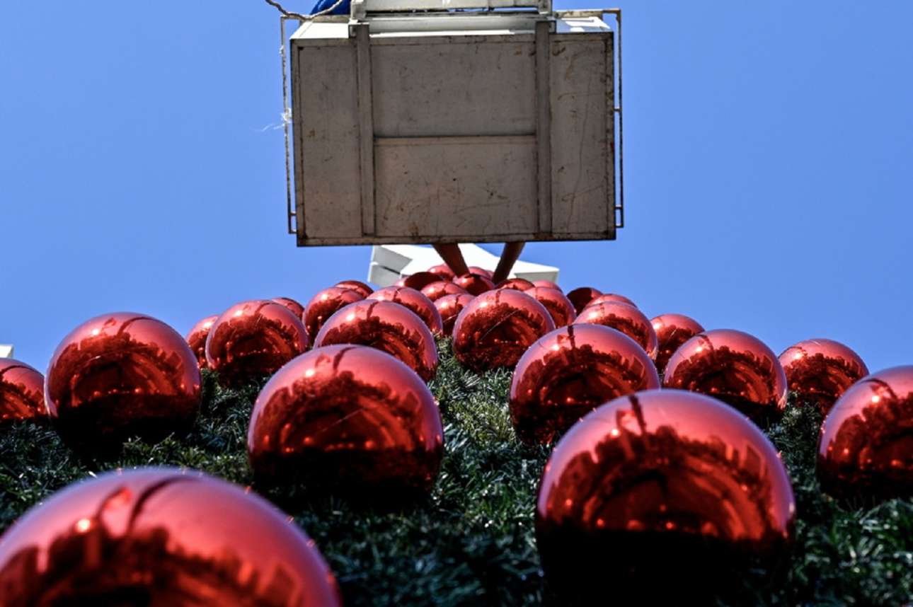 Και επί Γης ειρήνη, προσωρινή έστω: λίγη Βηρυτός καθρεφτίζεται στις μπάλες του χριστουγεννιάτικου δέντρου που διακόσμησε ο ανεβασμένος στον γερανό εργάτης