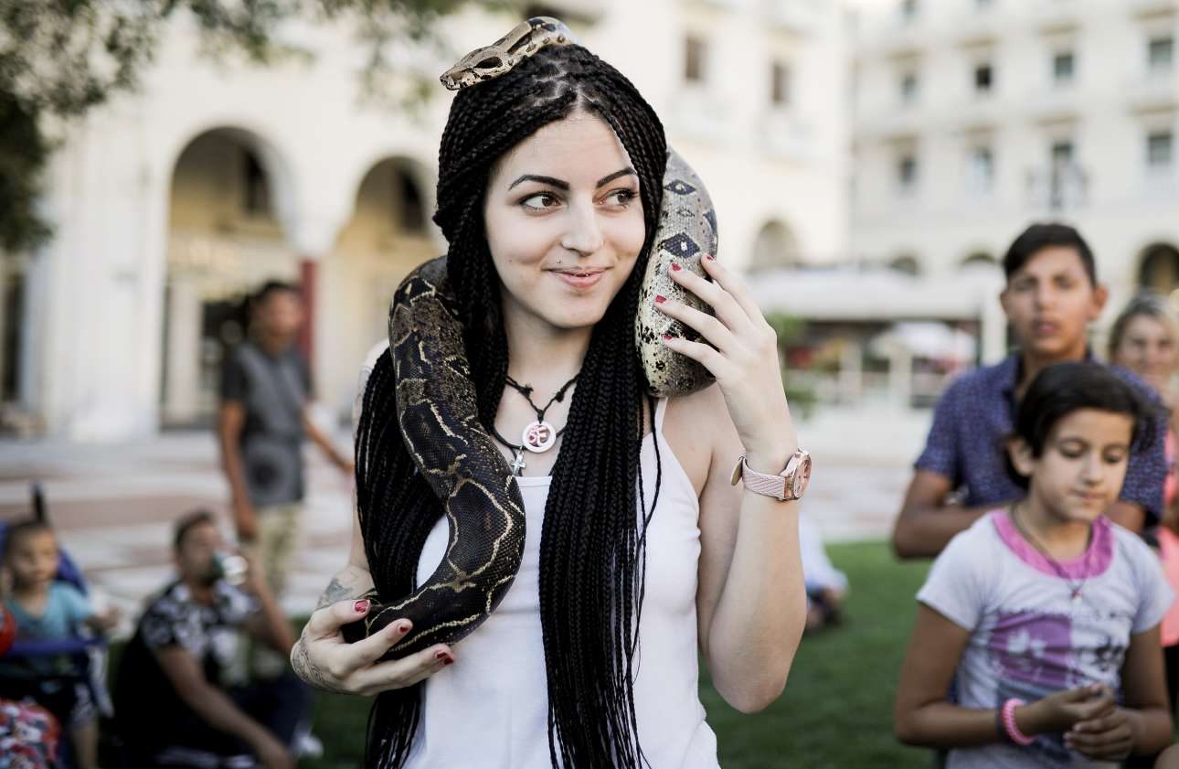Δευτέρα, 2 Ιουλίου, Ελλάδα. Βόλτα στην πλατεία Αριστοτέλους, παρέα με τον οικόσιτο βόα της έκανε μία κοπέλα στη Θεσσαλονίκη