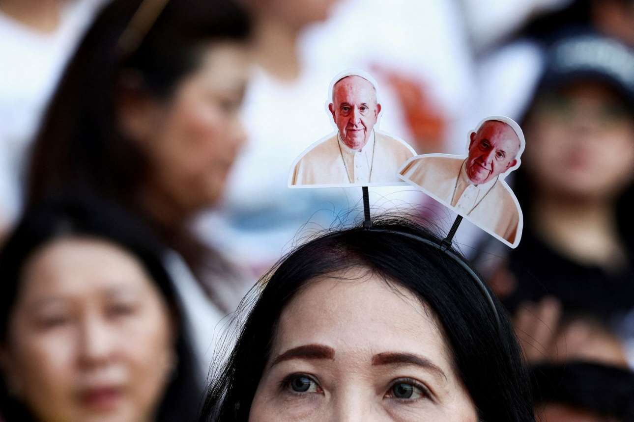 Διπλός πάπας στόλισε «κοκαλάκι» γυναίκειας κεφαλής – καρέ από γήπεδο όπου λειτούργησε ο ποντίφικας, στην Τζακάρτα της Ινδονησίας, ταιριαστό με τα λεγόμενα οπαδικά ήθη