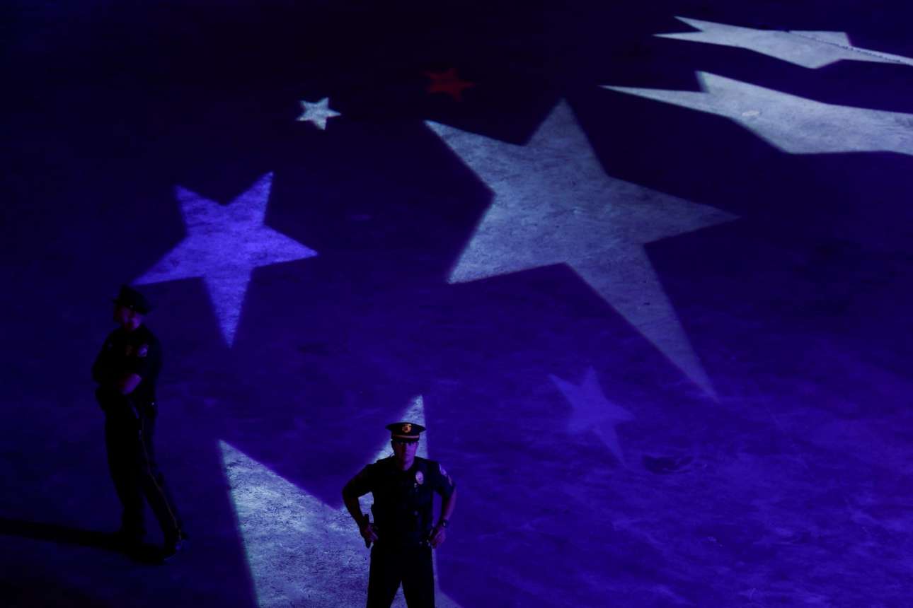 Ατμοσφαιρικό καρέ (νουάρ) από εμφάνιση του Τραμπ στην Πενσιλβάνια, με πρωταγωνιστές αστυφύλακες και αστέρια σε φόντο «μπλε κοβαλτίου» – υπαινιγμός για τη «βαθιά Αμερική» ενδεχομένως