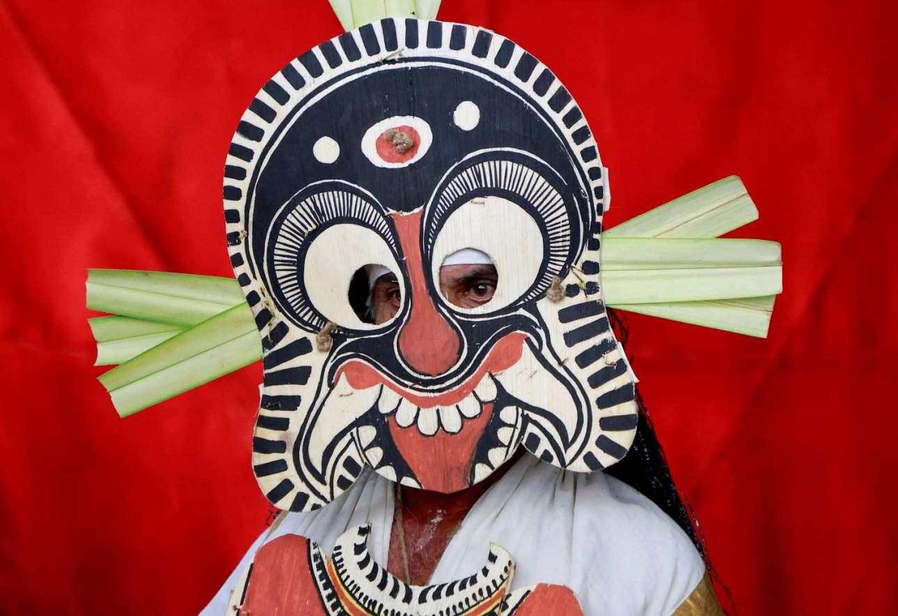 Ινδός χορευτής με προσωπίδα που θα ενθουσίαζε τον θεατράνθρωπο Ντάριο Φο, αν μπορούσε να τη δει. Ιδρώνεις σαν τη φοράς ακίνητος, πόσο μάλλον όταν χορεύεις