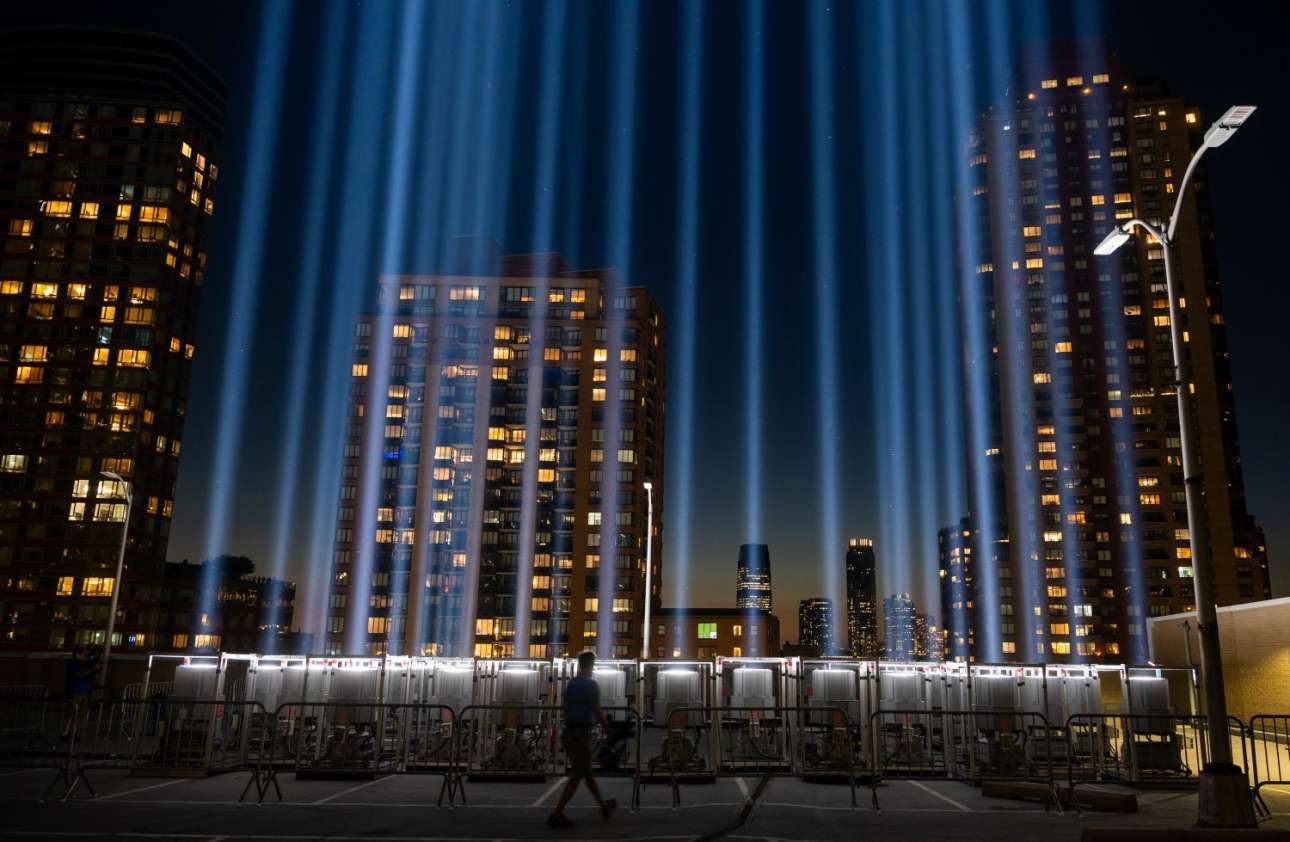 Πρόβα φωτοχυσίας για τις εκδηλώσεις μνήμης της 11/9 – ανήμερα της επετείου, κατά το σούρουπο και μέχρι τα ξημερώματα της επομένης, αυτές οι δέσμες θα είναι ορατές σε όλη τη Νέα Υόρκη