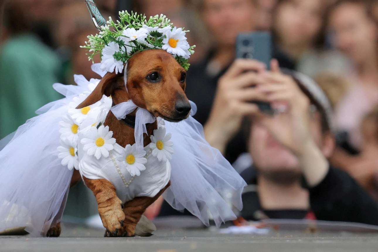 Καρέ από πασαρέλα «κοντοπόδαρων σκυλιών», μάλλον ατιμωτική για τα καημένα ζώα – λεπτομέρεια με σημασία: το σόου δεν έγινε στις ΗΠΑ ή στη Βρετανία, αλλά στη Ρωσία