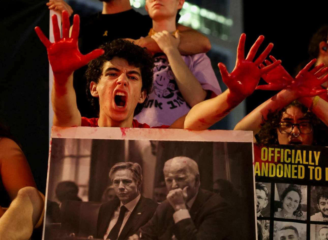 Οι «αιματοβαμμένες» μούντζες εστάλησαν στον Νετανιάχου, όμως τις λούστηκαν και οι Μπάιντεν-Μπλίνκεν του πλακάτ – οι ισραηλινοί διαδηλωτές ζητούν άμεσα ειρήνη, ώστε να απελευθερωθούν οι όμηροι