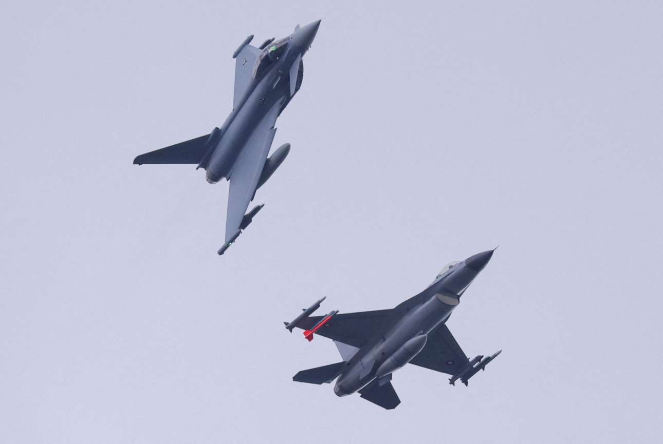 Πάνω από την αμερικανική βάση του Ράμσταϊν, στη Γερμανία, ΝΑΤΟϊκά μαχητικά ασκήθηκαν σε ελιγμούς αναχαίτισης – το γερμανικό (αριστερά) δεν ήταν… «Μέσερσμιτ», ωστόσο έφερε τον τευτονικό μαύρο σταυρό