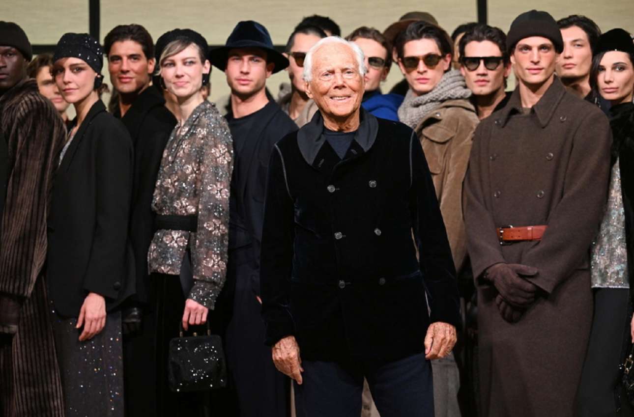 Ο Τζόρτζο Αρμάνι φωτογραφήθηκε με τα κορίτσια και τα αγόρια του (φοβερή η μπολσεβίκικη χλαίνη, δεξιά) στο κλείσιμο της μιλανέζικης πασαρέλας του με ανδρικά ενδύματα για τον… επόμενο χειμώνα – διότι η μόδα οφείλει να αισιοδοξεί