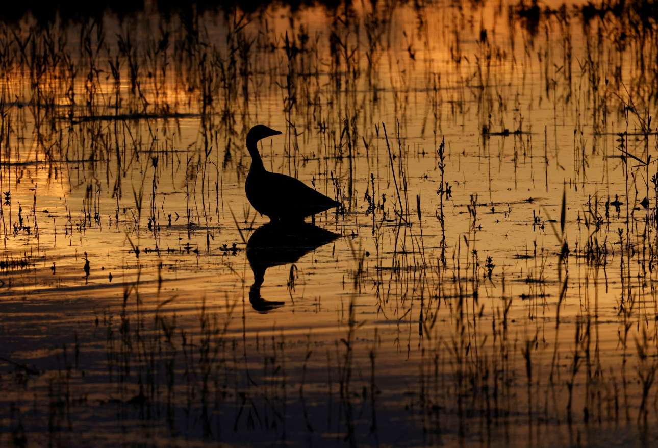Λιγοστό το νερό κάτω από τα πόδια της χήνας στη λίμνη Zicksee, πάντως… νερό, αφού πέρσι υπήρξε πρόβλημα ξηρασίας εκεί σε βαθμό που ανέπεμψε επιτόπια δέηση η (ελληνορθόδοξη) Μητρόπολη Αυστρίας – το χρυσοπόρφυρο δείλι γλύκανε το καρέ