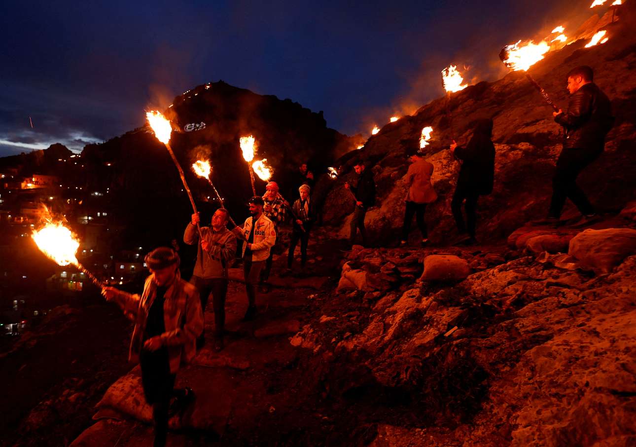 Λαμπαδηφόροι κούρδοι του Ιράκ πανηγυρίζουν τη γιορτή Νεβρόζ, δηλαδή την πρώτη ημέρα της άνοιξης και τον ερχομό του νέου έτους κατά την περσική ζωροαστρική παράδοση – γιορτή η οποία, βέβαια, έχει πλέον λάβει μουσουλμανικό χαρακτήρα