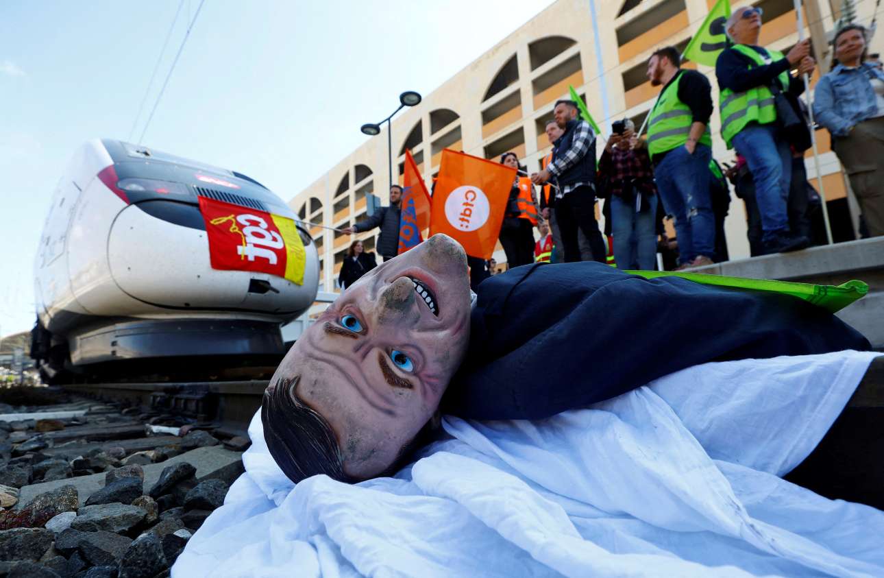Καρέ από τη Νίκαια της Γαλλίας που μοιάζει βγαλμένο από φιλμ κινουμένων σχεδίων τύπου «Μαδαγασκάρη»: η μαριονέτα-Μακρόν ρίχτηκε από τους απεργούς σιδηροδρομικούς στις ράγες για να σταματήσει το τρένο TGV που τρέχει σαν βολίδα – η ασφαλιστική μεταρρύθμιση πέρασε από τη Βουλή, σκάλωσε όμως σε πλατείες, δρόμους και αποβάθρες