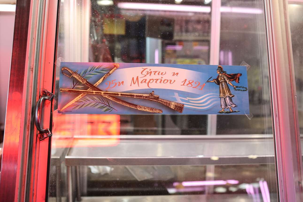 Παλιομοδίτικου στυλ αφισέτα, κολλημένη με σελοτέιπ σε βιτρίνα της Βαρβακείου: ο λαός ανέστη, η Ιστορία κατέγραψε, η Δόξα στεφάνωσε