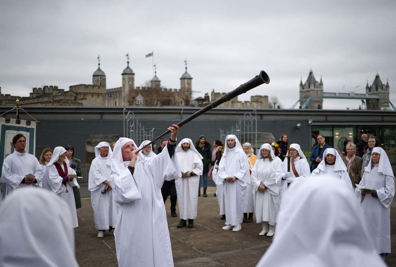 Δρυίδες του Λονδίνου σε διάταξη κλοιού πέριξ του προεξάρχοντος με το «αρχαίο» κέρας, «ιερουργούν» στο Tower Hill κατά τη διάρκεια παγανιστικής τελετής με αφορμή τον εορτασμό της εαρινής ισημερίας – στιγμιότυπο της 20ής Μαρτίου (ο χρόνος ενεστώς φυσικά, πλην άνευ σημασίας)
