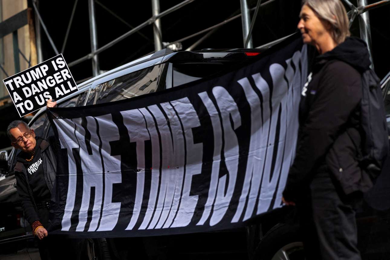 H πιο μεγάλη ώρα είναι τώρα – ατάκα με μεγάλη γκάμα, πλέει από τον έρωτα μέχρι τον θάνατο και από το μείζον μέχρι το χωρατό, ωστόσο το πανό που τη διαλαλεί έξω από το κτίριο της Εισαγγελίας Νέας Υόρκης ενδιαφέρεται μόνο για τη σύλληψη του Τραμπ: «Είναι επικίνδυνος για όλους μας» σιγοντάρει και το πλακάτ με τη φωνούλα του