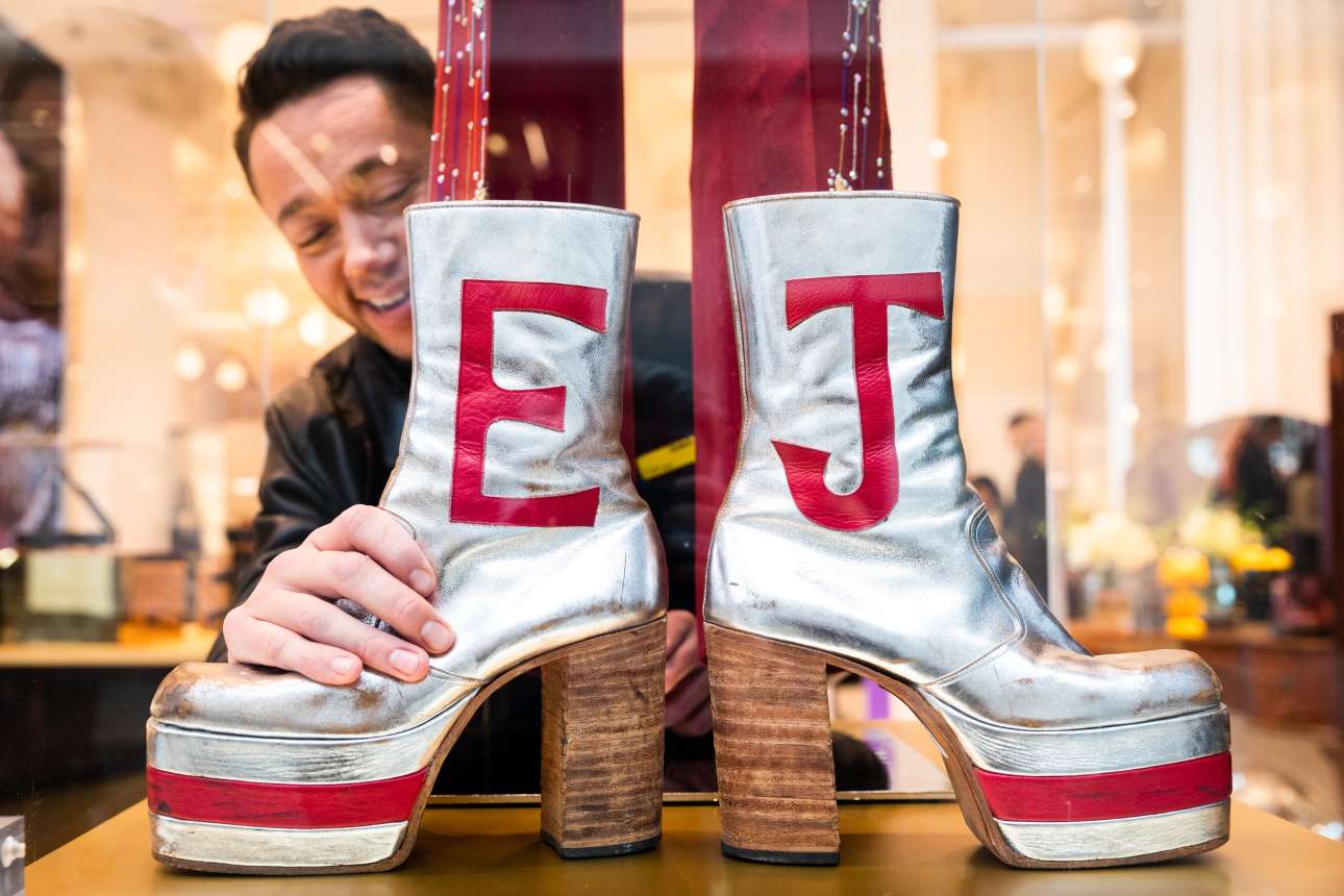 Στολές από παλιές παραστάσεις του Ελτον Τζον εκτίθενται στο λονδρέζικο πολυκατάστημα Selfridges – στο καρέ βλέπουμε ένα «υπογεγραμμένο» ζευγάρι μπότες του φημισμένου ποπ τραγουδιστή, ο οποίος, σημειωτέον, σνομπάρει το σόου της στέψεως του Καρόλου Γ΄, καθώς ήταν φίλος με τη συγχωρεμένη την Νταϊάνα