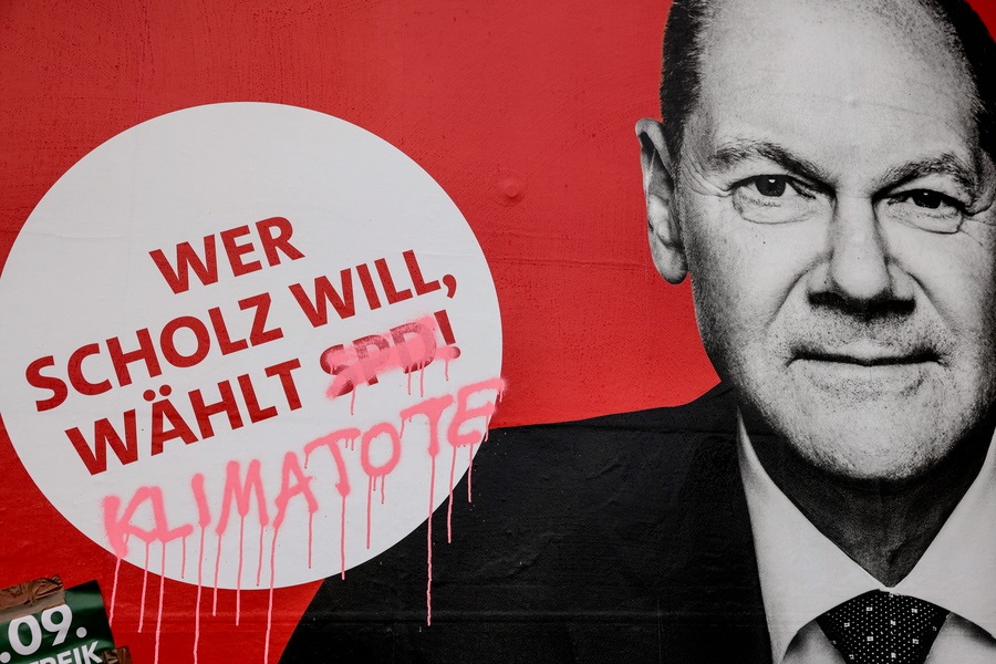 Το κόκκινο πόστερ των Σοσιαλδημοκρατών, με τον υποψήφιο καγκελάριο επιμελώς αξύριστο και με το σύνθημα «Οποιος θέλει τον Σολτς, επιλέγει SPD», δέχθηκε την επίθεση του ροζ σπρέι: το αρκτικόλεξο του γερμανικού κόμματος αντικαταστάθηκε από τη φράση «κλιματικός θάνατος»