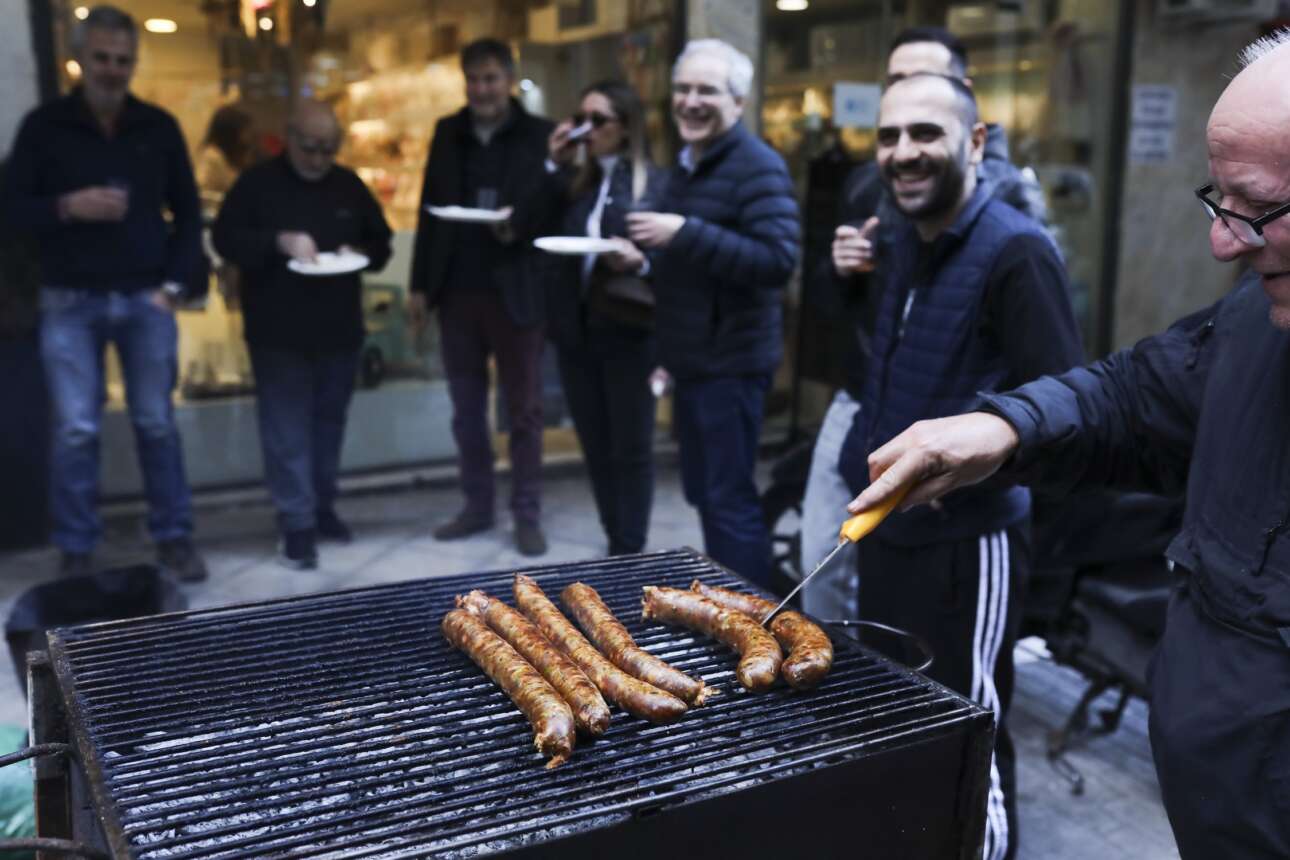 Αθηναϊκή Τσικνοπέμπτη σε εμπορική στοά: στη φωτογραφία βλέπουμε τη θεία ιλαρότητα (που αντιστέκεται σθεναρώς και μας σώζει με κάθε ευκαιρία) όχι όμως την κάπνα, αφού στη θράκα σιγοκαίει μόνο η χόβολη – ούτε την τσίκνα από τα χωριάτικα λουκάνικα μυρίζουμε, όμως δεν απογοητευόμαστε καθώς η τεχνολογία, όπως λένε, καλπάζει