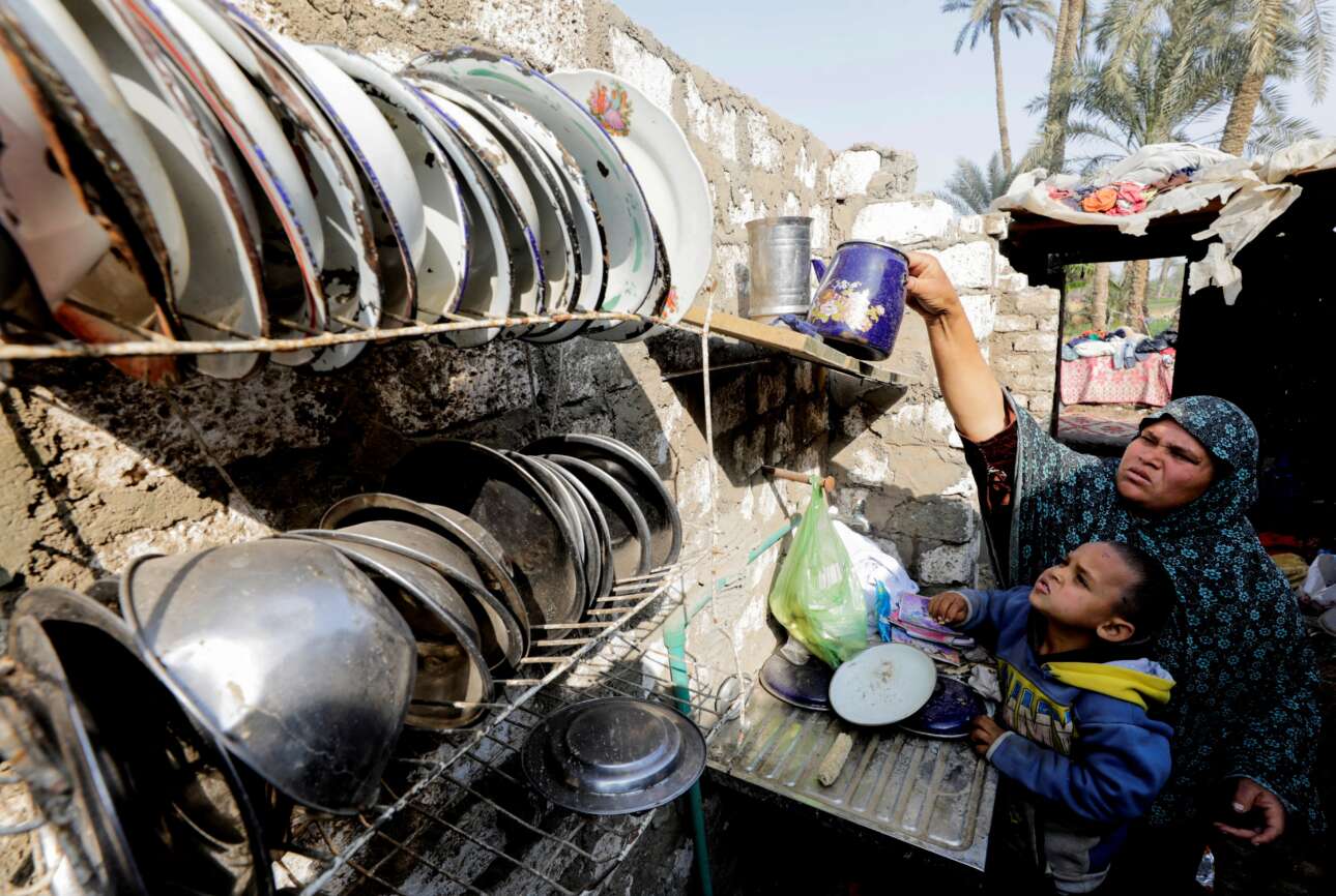 Υπαίθρια κουζίνα έχει το νοικοκυριό στο φελαχοχώρι Ελ Αγιάτ (Ο Κλαίων), δίπλα στον Νείλο: τα πλυμένα πιάτα που στεγνώνουν στον ήλιο είχαν λερωθεί από το καθημερινό φαγητό του φτωχού, τα φούλια, δηλαδή από τα αιγυπτιακά κουκιά από τα οποία παρασκευάζονται τα αυθεντικά φαλάφελ – δύσκολη ζωή, και έχει ο Θεός