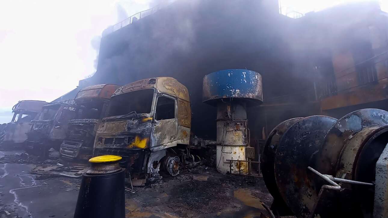 Συνέχεια στη φωτογραφική αφήγηση της πικρής ιστορίας των ρημαγμένων μεταφορικών μέσων δίνει το καρέ από το ντεκ του ιταλικού οχηματαγωγού «Euroferry Olympia»: η καταστροφή εδώ ήταν μεγάλη, αφού το πλοίο κάηκε μεσοπέλαγα, κοντά στην Κέρκυρα, μαζί με τα φορτηγά που κουβαλούσε – και οι σκοτωμένοι του, «σκελετοί» στα αμπάρια