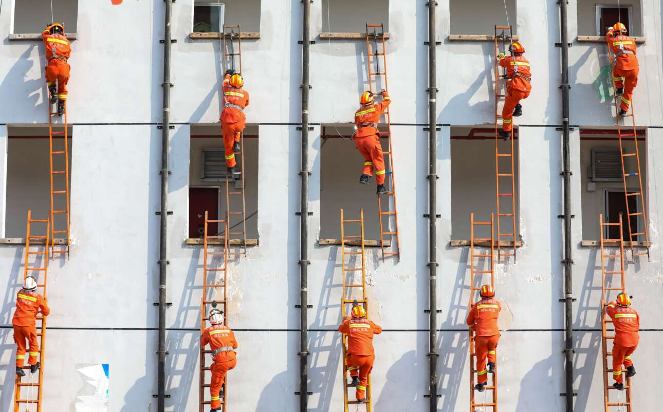 Ακροβατικές επιδείξεις από κινέζους πυροσβέστες στην περιοχή Τονγκρέν κατά τη διάρκεια άσκησης: αν δεν ήταν εκπαιδευτικός, ο τοίχος μπορεί να αποτελούσε και σκηνικό κινεζικής όπερας, σύγχρονης, με θέμα επαναστατικό – ας πούμε, πώς επιτυγχάνεται η κατάσβεση των ταξικών παθών διά της αναρριχήσεως στην πολυκατοικία της νομενκλατούρας