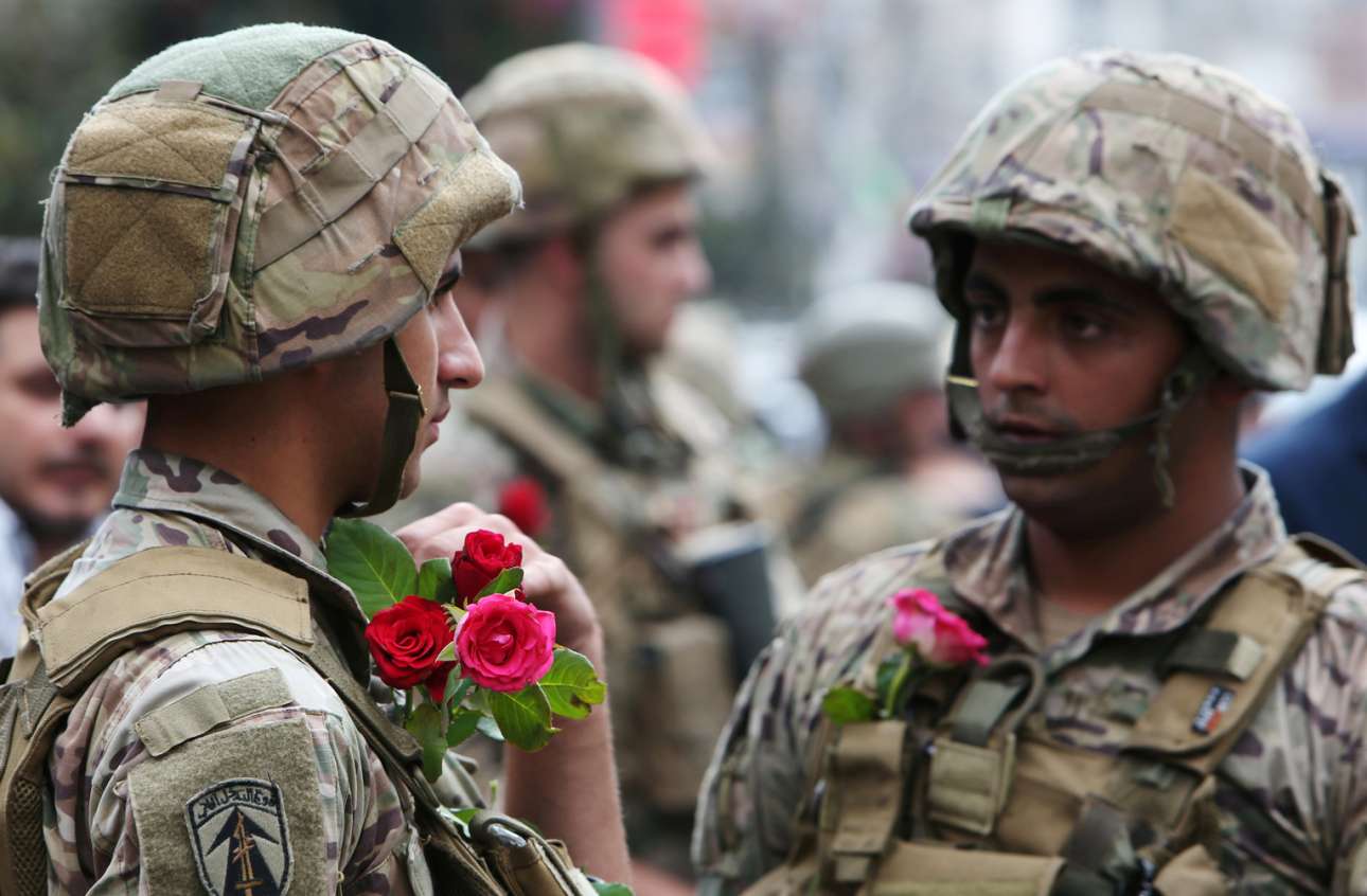 Ανθη και στην εξάρτυση των λιβανέζων στρατιωτών – τους τα προσέφερε ο κόσμος που πλημμύρισε τους δρόμους συμμετέχοντας σε αντικυβερνητικά συλλαλητήρια