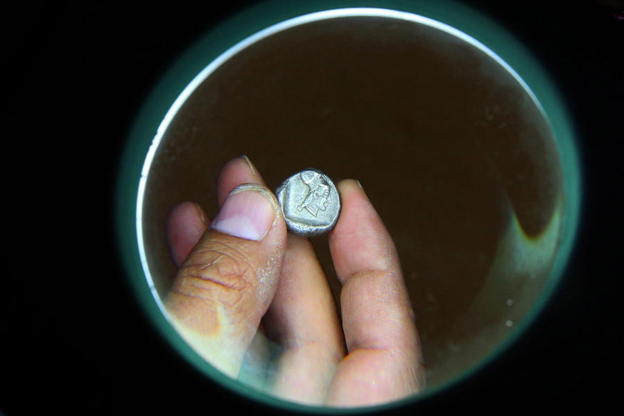 Ο ιστορικός και νομισματολόγος Κωνσταντίνος Λαγός εξετάζει ένα αργυρό νόμισμα της ύστερης αρχαϊκής περιόδου που βρέθηκε στις ανασκαφές της Αρχαίας Τενέας, στην Κορινθία